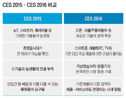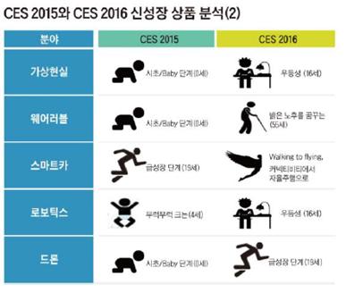 1년 사이 CES에서 급격한 트렌드의 변화는 없었지만, 2015년 관심을 끌었던 기술들을 훨씬 다양한 업체들이 선보였다. ‘신기술’의 상용화가 멀지 않았음을 실감할 수 있었다. 특히 증강현실(AR)·가상현실(VR), 웨어러블, 스마트카, 로보틱스, 드론의 5가지 분야는 전시 기업의 수가 눈에 띄게 증가했다.